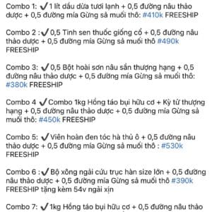 | Combo 3 | 0,5 kg Bột hoài sơn nâu sần thượng hạng 0,5 kg Đường nâu thảo dược 0,5 kg Đường mía Gừng sả muối thô |